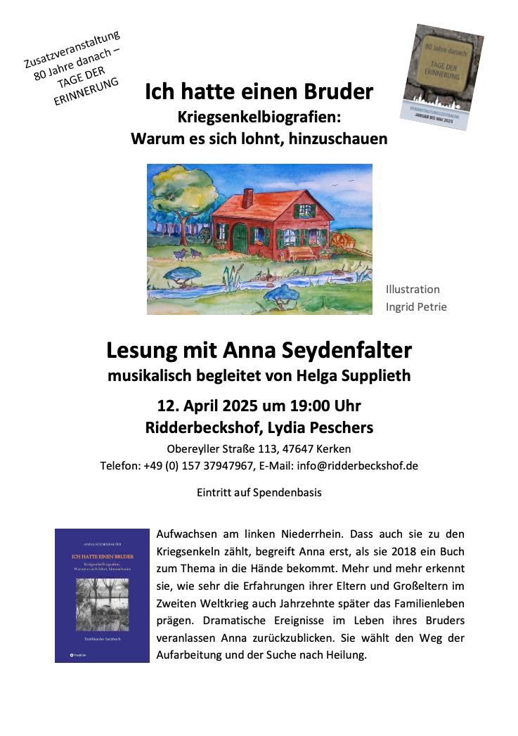 Aufwachsen am linken Niederrhein. Dass auch sie zu den Kriegsenkeln zählt, begreift Anna erst, als sie 2018 ein Buch zum Thema in die Hände bekommt. Mehr und mehr erkennt sie, wie sehr die Erfahrungen ihrer Eltern und Großeltern im Zweiten Weltkrieg auch Jahrzehnte später das Familienleben prägen. Dramatische Ereignisse im Leben ihres Bruders veranlassen Anna zurückzublicken. Sie wählt den Weg der Aufarbeitung und der Suche nach Heilung.